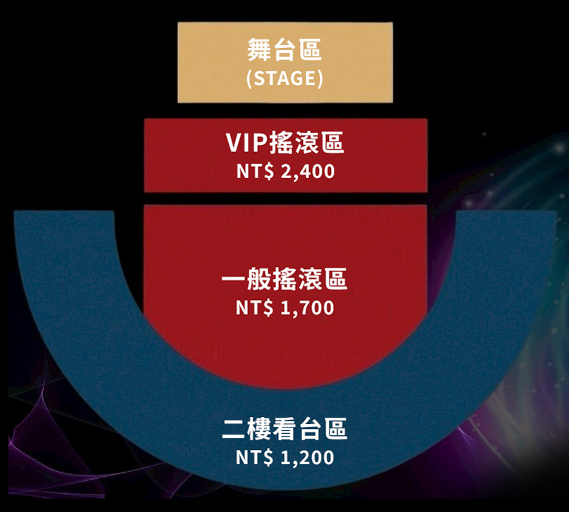 ★全場皆為自由入座;VIP 搖滾區與一般搖滾區為站席,二樓看台區為坐席。